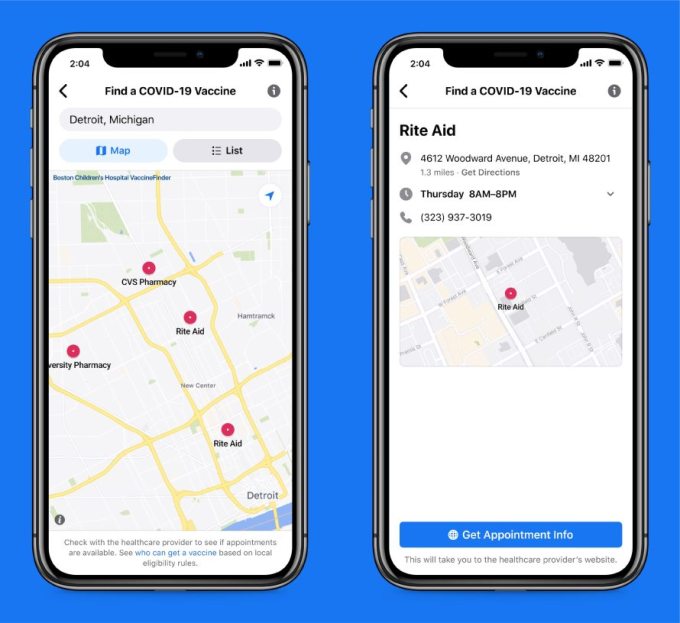 “By working closely with national and global health authorities and using our scale to reach people quickly, we’re doing our part to help people get credible information, get vaccinated and come back together safely,” Facebook writes in the Newsroom post that links directly to a Facebook post by founder Mark Zuckerberg also trailing the new measures, including the launch of a tool that will show U.S. Facebook users where they can get vaccinated and provide them with a link to make an appointment.